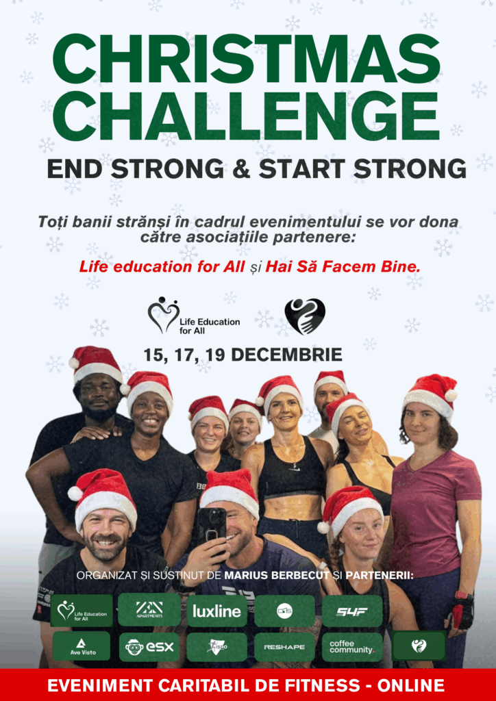 Într-o perioadă în care excesele culinare și sedentarismul definesc adesea sărbătorile de iarnă, românii sunt provocați să facă o schimbare în bine. Christmas Challenge: End Strong & Start Strong este evenimentul 100% online și caritabil care își propune să transforme caloriile de sărbători în fapte bune, acesta se desfășoară de-a lungul a 3 zile de educație în fitness, mobilitate și longevitate.