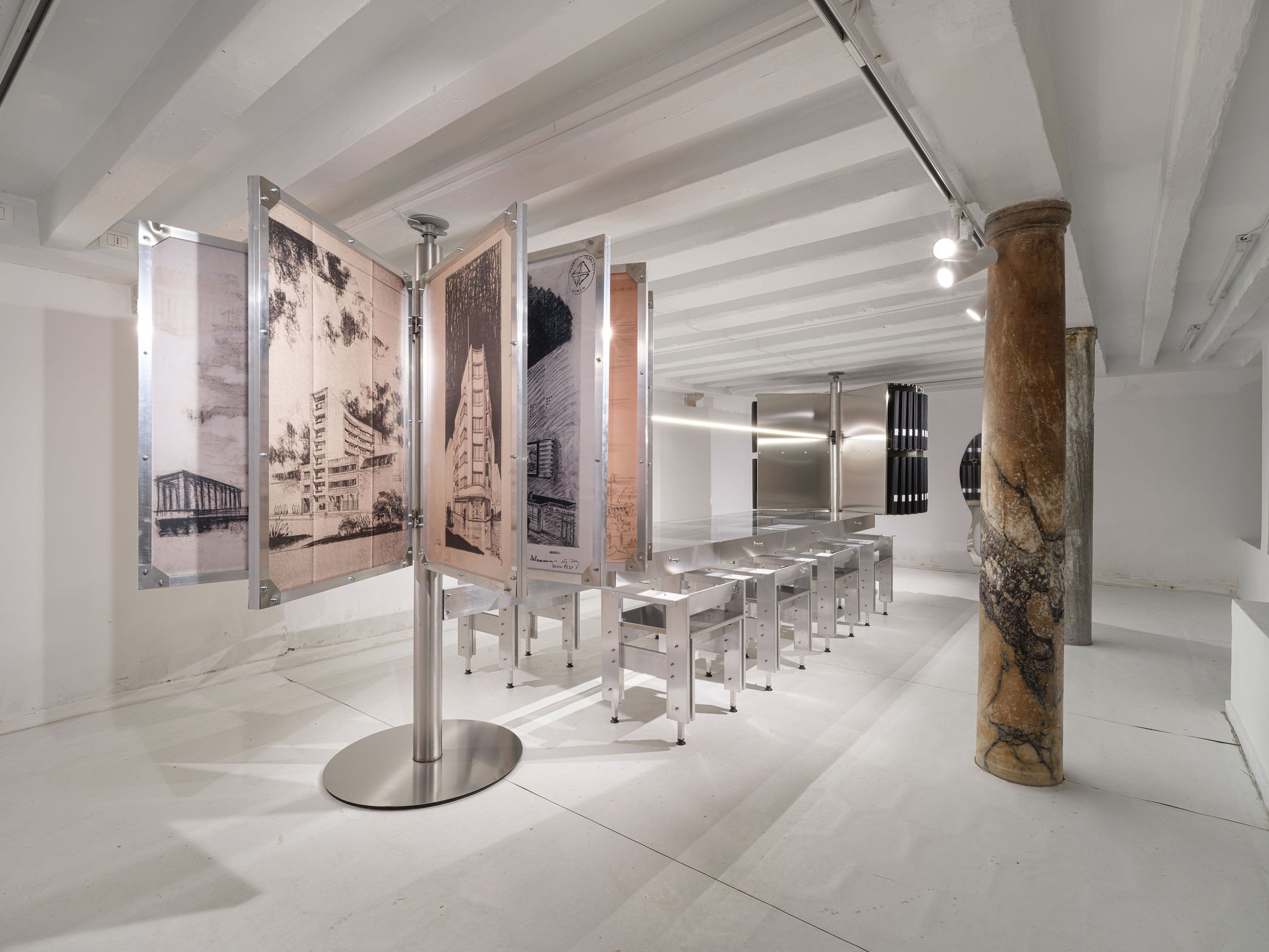 Proiectul Human Scale s-a desfășurat în două spații complementare. În Pavilionul României din Giardini, instalația realizată de Vlad Nancă și Muromuro a reunit lucrări ale artistului prezentate în dialog cu o selecție cronologică de desene și hărți istorice, într-un parcurs care aduce în prim-plan relația dintre corpul uman și spațiul construit. În contrast, Noua Galerie a Institutului Român de Cultură și Cercetare Umanistică a prezentat arhiva de desene ce a stat la baza proiectului, oferind publicului un cadru de cercetare asupra reprezentării, memoriei și ideologiilor spațiului construit. Împreună, cele două spații au funcționat ca poli ai aceleiași investigații: unul dedicat experimentului vizual și corporal, celălalt reflecției critice și documentare.