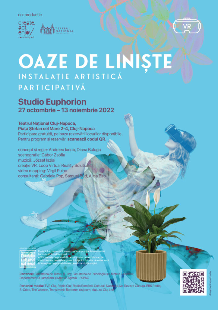 Instalația artistică participativă OAZE DE LINIȘTE este o co-producție dintre asociația Create.Act.Enjoy și Teatrul Național din Cluj-Napoca și face parte din programul „Tineri creatori“ al Teatrului Național, care își propune să sprijine și să lanseze tinerii creatori, prin oferirea unui cadru profesionist de creare și prezentare, precum și accesul la categorii de public divers.